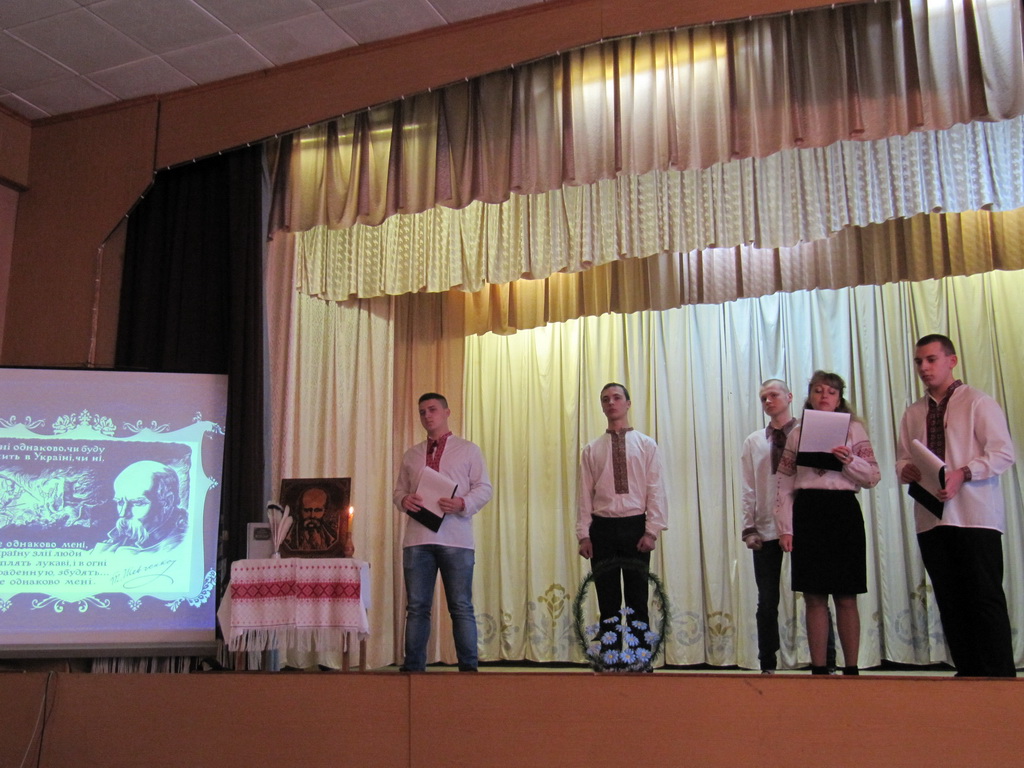В рамках декади методичної комісії суспільно-гуманітарних дисциплін Шевченківські дні у ВПУ №7 м. Калуша розпочалися урочистою лінійкою «Єднаймо душі словом Кобзаря», яку провела викладач української мови та літератури Босович Л.Я. з учнями групи №8 та майстром виробничого навчання Парубком О.Й.