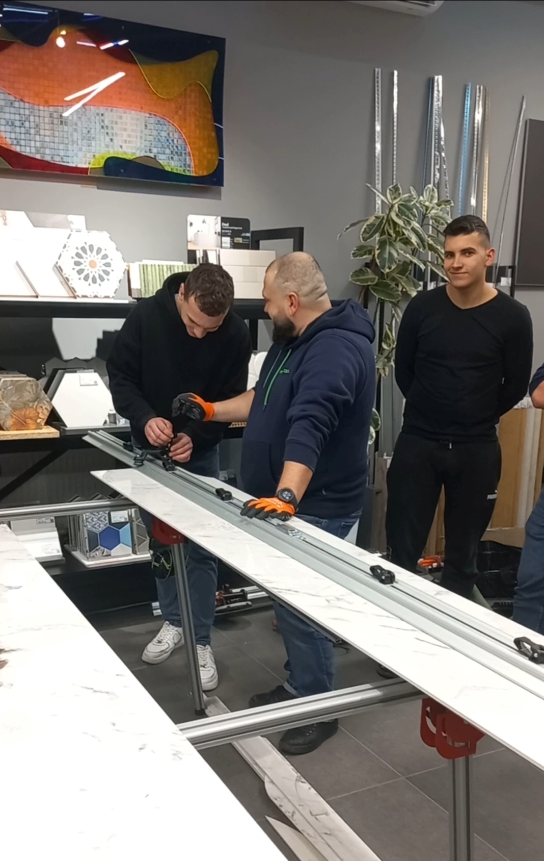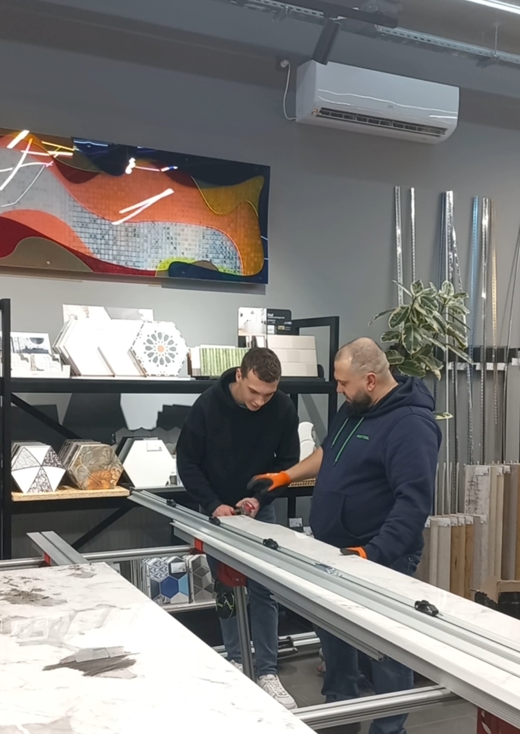 Технологія порізки і формування кута широкоформатної плитки вимагає особливої майстерності. Провідні майстри демонстрували цю технологію і надавали можливість проявити професійні навички запрошеним.