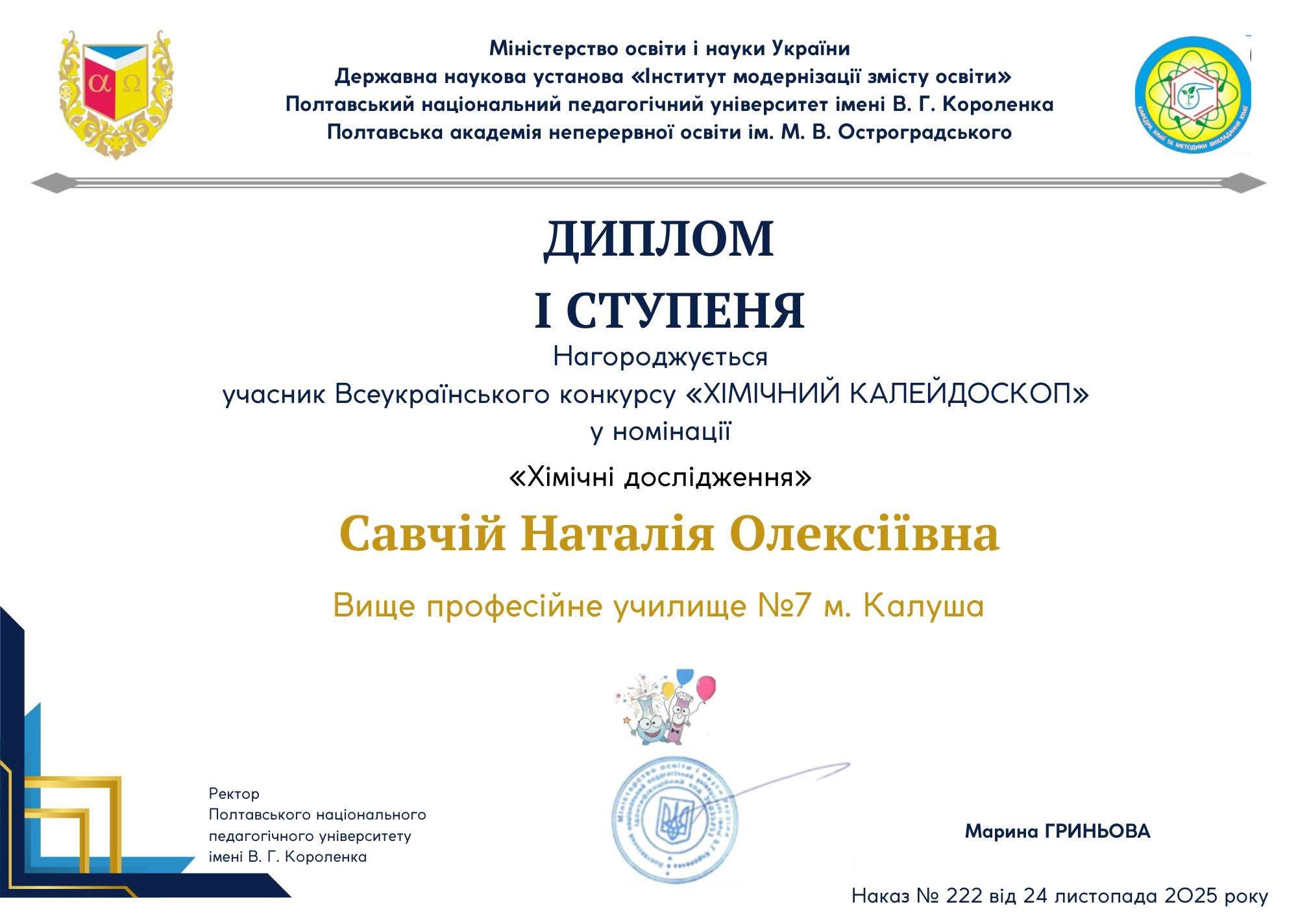 Вітаємо викладачку Вищого професійного училища №7 м.Калуша Наталію САВЧІЙ, яка разом із студентами гідно представили наш навчальний заклад на Всеукраїнському конкурсі "Хімічний калейдоскоп", здобувши І місце та Диплом переможця.
